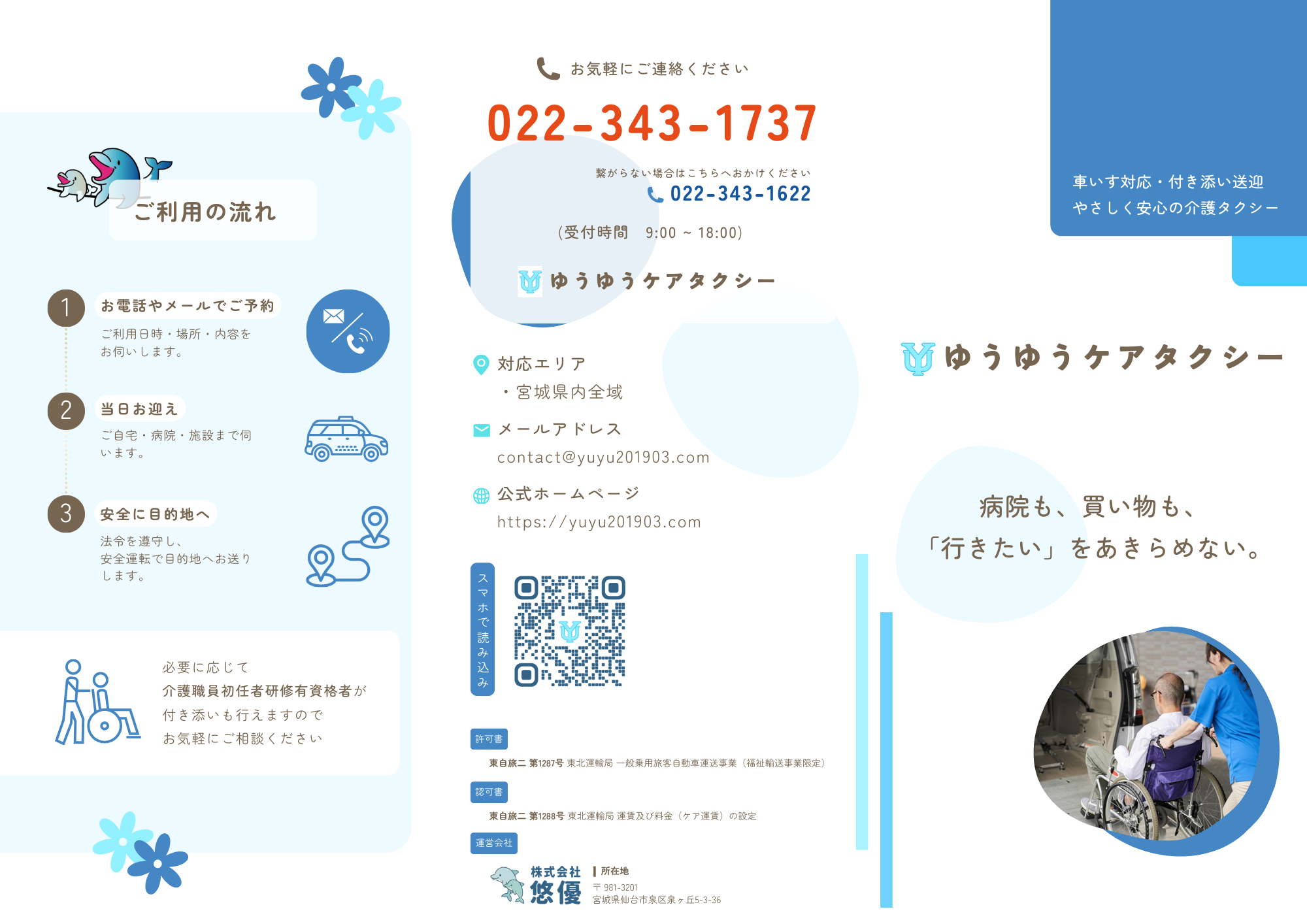 ゆうゆうケアタクシーは、病院への通院や退院・転院、リハビリはもちろん、お買い物や銀行、役所への外出、冠婚葬祭やお墓参りなど、「行きたい」というお気持ちを大切に、安心・安全にサポートするサービスです。
